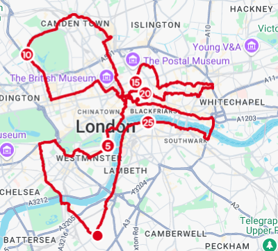 Although we didn't get time to sight-see, we did cover an awful lot of London. Starting in Larkhall Park, we headed north west over to Battersea and Knightsbridge, then onto Buckingham Palace and through to Westminster. Covent Garden, Lincoln's Inn Fields, Marylebone, Regents Park, Regent's Canal, Camden, Kings Cross, Russell Square, Lincoln's Inn Fields (yes, a second time), Clerkenwell, Barbican, The Gerkin, Liverpool St., London Wall, Lincoln's Inn Fields (a third time), St. Pauls, Monument, Tower of London, Tower Bridge, HMS Belfast, and along the South Embankment all the way round to Vauxhall, and then heading south to Larkhall Park and the finish line.Our overall pace was 22-23 minutes per mile. This was pretty good really given the number of tourists and cyclists we had to overtake, dodge and avoid on the way, elbows at the ready. There were so many people on Tower Bridge and the South Bank enjoying the hot and sunny afternoon.